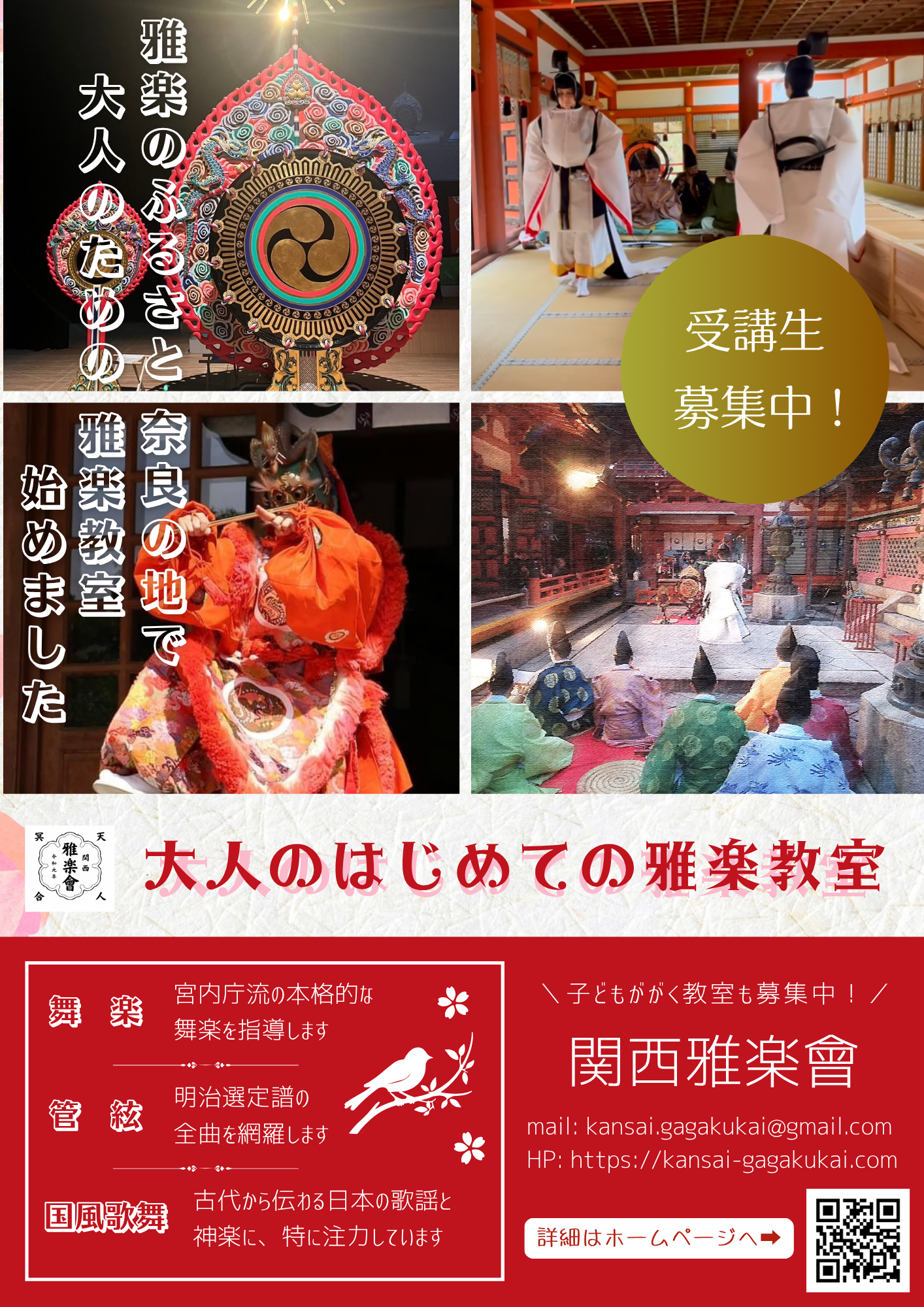 ※こちらは、本格的に雅楽を習得したい方向けの教室です。雅楽に興味があり「雅楽を体験してみたい!」という方には、大人と子どもが一緒に雅楽を楽しんで学べる「子どもががくくらぶ」にご参加ください。三笠公民館(奈良)、大安寺、廣瀬大社(河合町)の3つの伝習所にて毎月開催しています。お気軽にお問い合わせください。