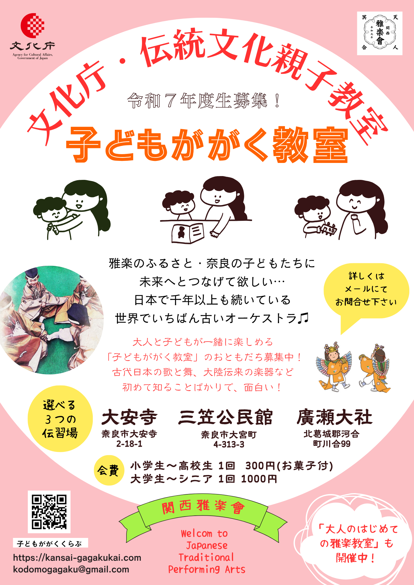 ・本格的に雅楽を習得したい方は「おとなのはじめての雅楽教室」にご参加ください。各管3名定員で、令和7年度後期生は8月から募集します。