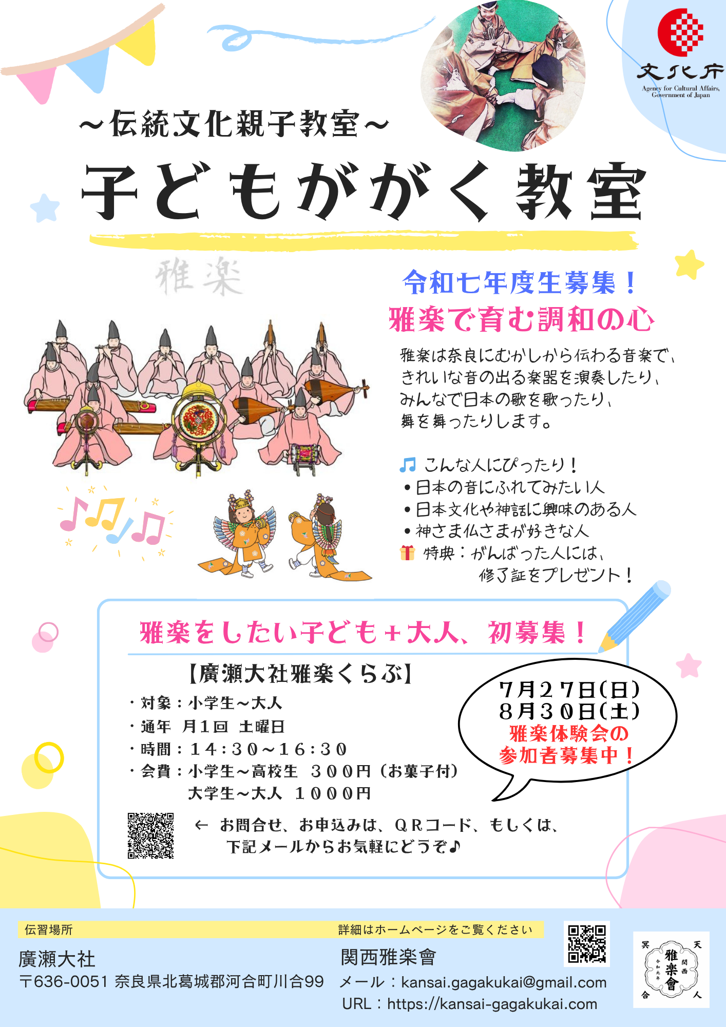 9月7日(日) | 10:30-12:00 | 伝統文化親子教室【廣瀬大社④】朗読でつづる雅楽+体験会☆彡(任意参加) ・朗読雅楽会 ・雅楽体験 |